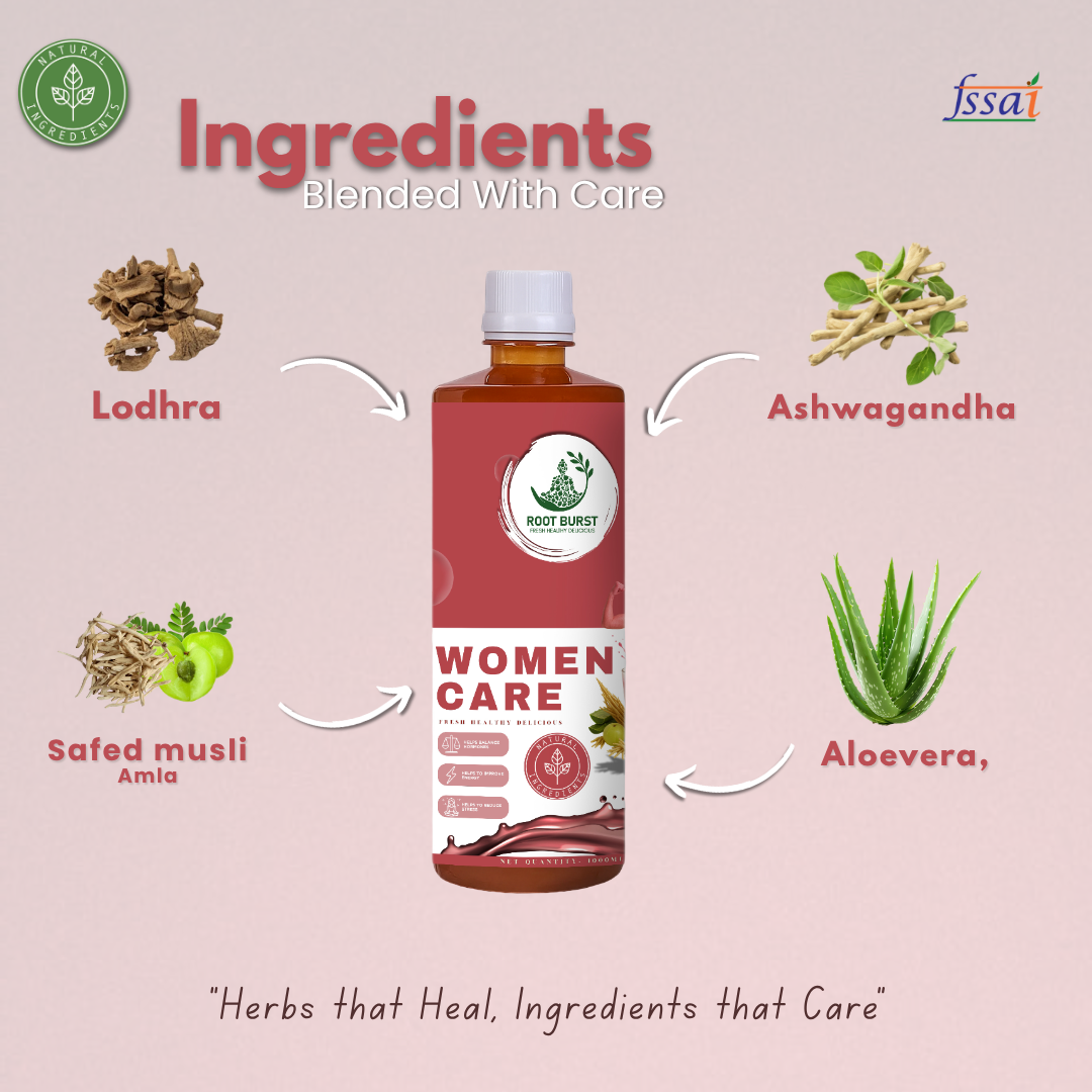"Root Burst Woman Care Juice is a powerful Ayurvedic formulation crafted to support the unique wellness needs of women across all life stages. This herbal juice combines the time-tested benefits of 12 potent herbs including Lodhra, Shatavari, Ashoka, Bala, Ashwagandha, Safed Musli, Amla, Neem, Aloe Vera, Coriander, and Safed Kaunch—each selected for its role in promoting hormonal balance, menstrual health, energy, and overall vitality. Whether you're facing irregular cycles, fatigue, stress, or looking to support your reproductive system, this juice offers a natural and holistic approach rooted in ancient Ayurvedic wisdom.